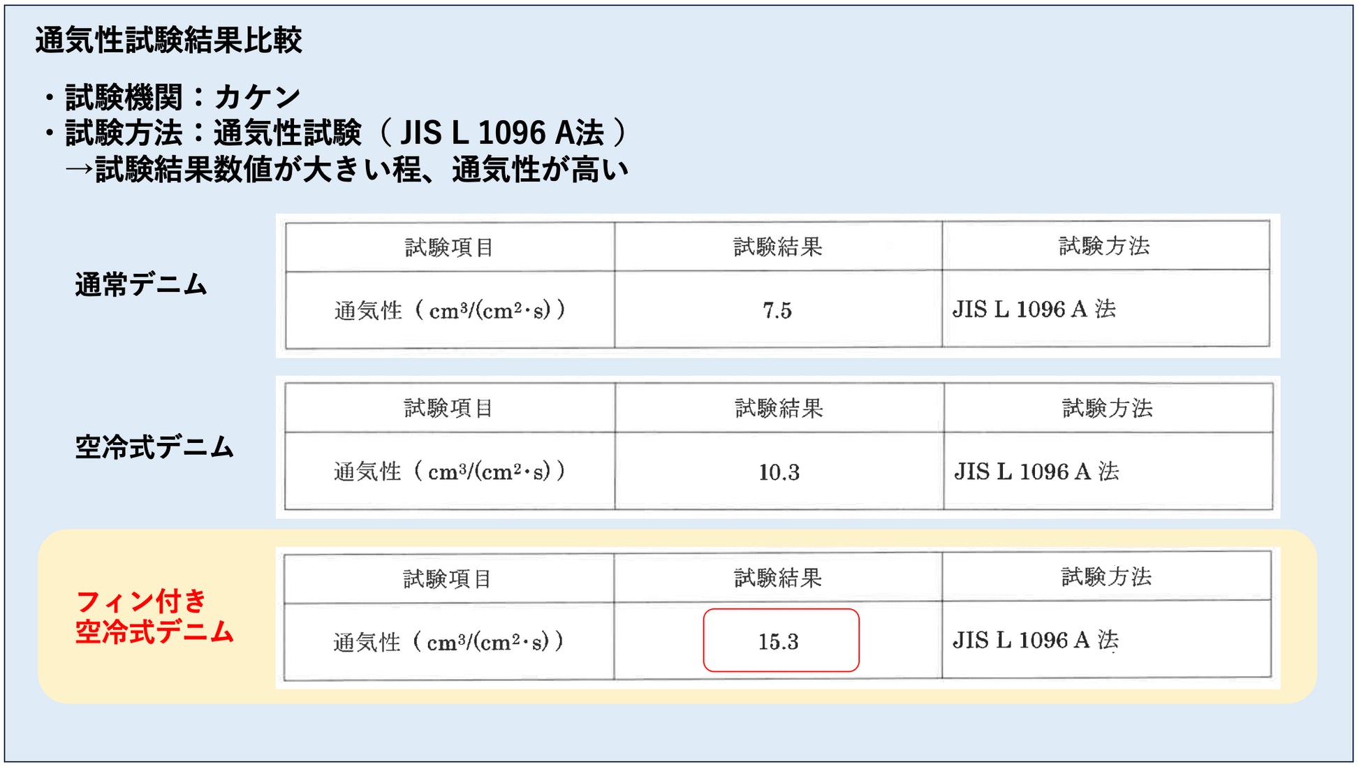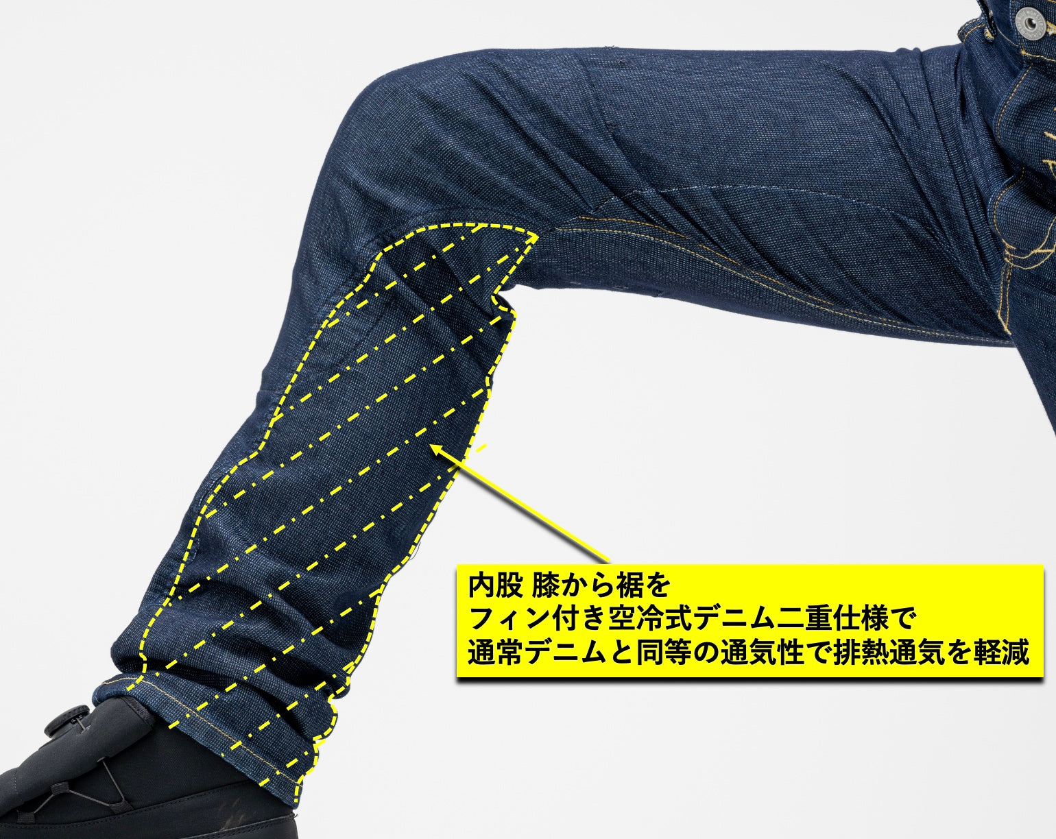 【空冷式ジーンズ】の最大の機能は、走行風を取り込む事です。この機能を保持し、その中で可能な限り排熱対応をする解が25年モデルの【排熱対応パネル】です。上出の第三者機関での通気度試験を参考にして頂ければご理解できると思いますが、フィン付き空冷式デニムを二重にすると通気度が半減します。そうなると通常のデニム同程度の通気度になります。過去モデル比で排熱取り込みが軽減され脚に伝わる熱さが軽減します。