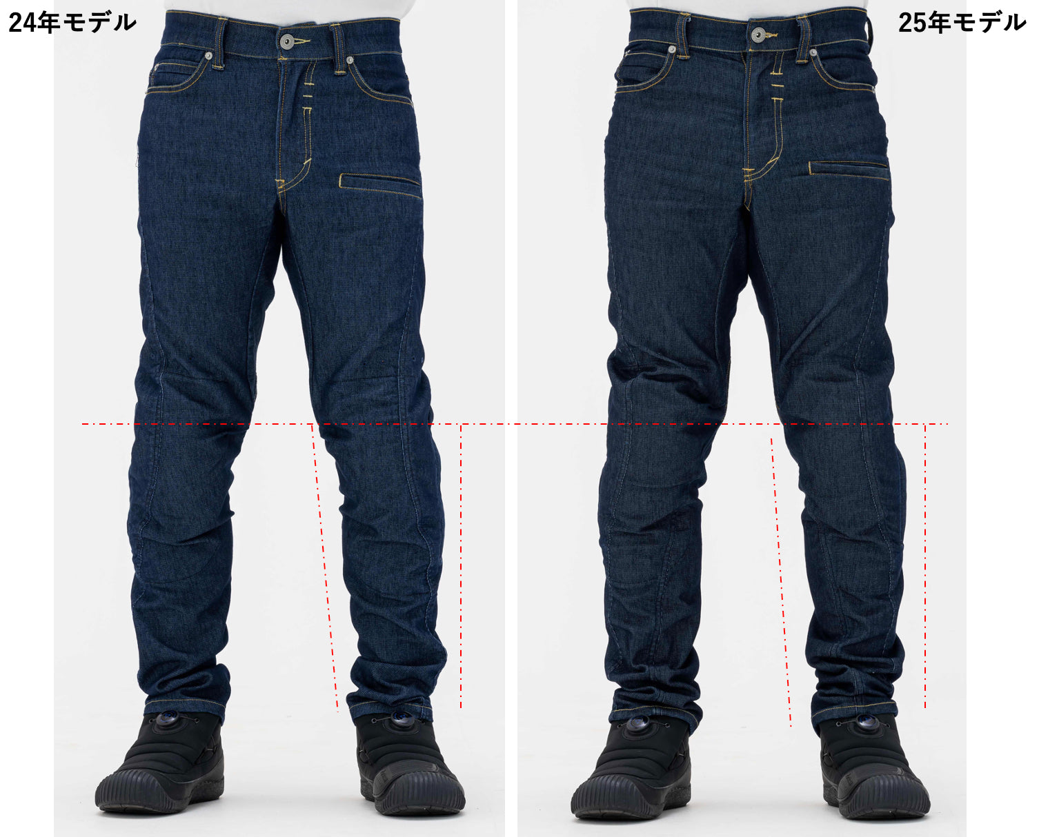 左が24年モデル。右が25年モデルです。イケオジになるにはタイトシルエットは必須です!タイトシルエットの範疇で膝から裾までにゆとりがあります。股下も2.0cmですが長くしています。これが何故進化なのか?