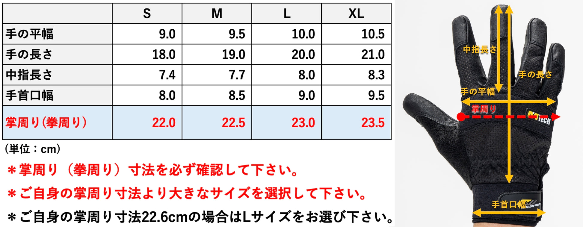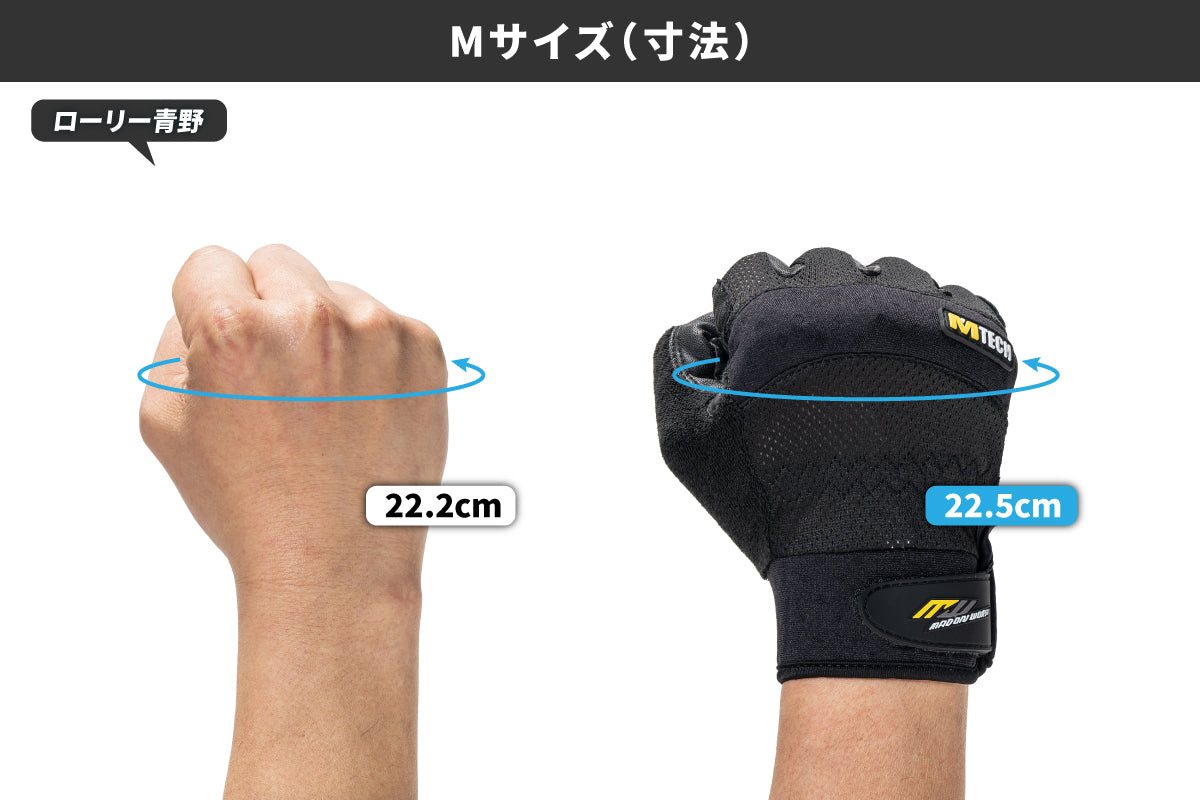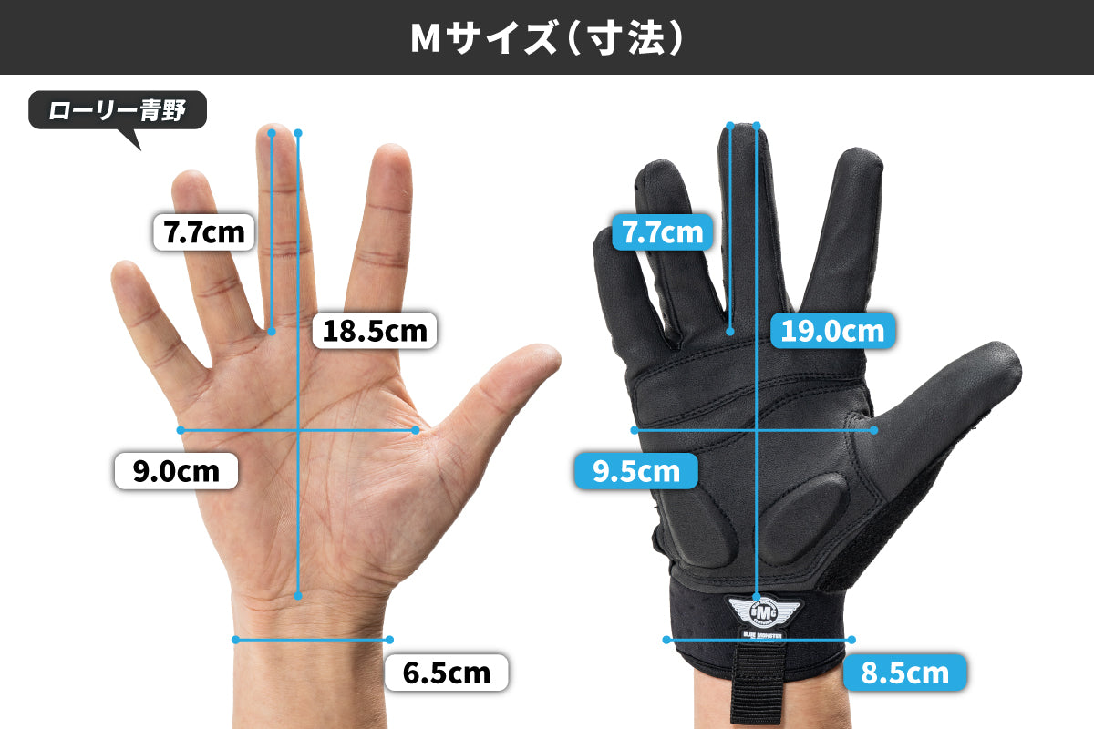 ・Mサイズ( 手の平幅9.5cm / 中指の長さ7.7cm / 拳周り22.5cm )