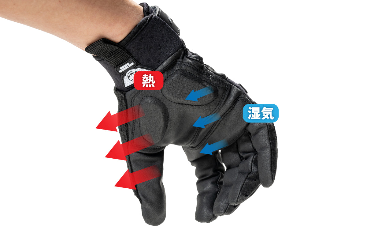 エアインテーク化で手に直接走行風を取り込む事が実現した空冷式グローブは効率的にライダーの手を冷やし熱と湿気を排出し、グローブ内を常に涼しい環境に保ちます!