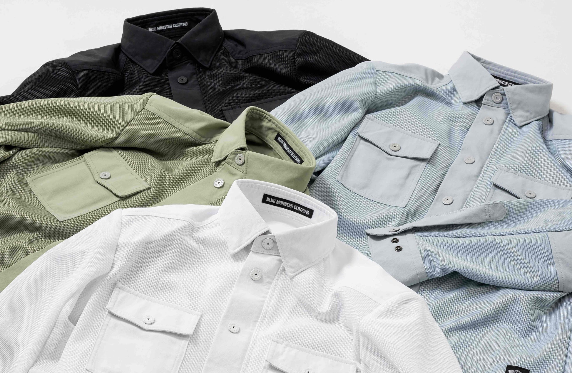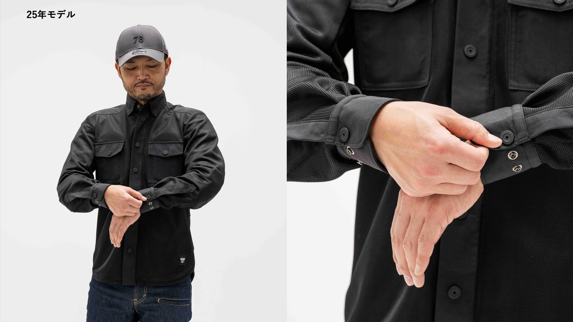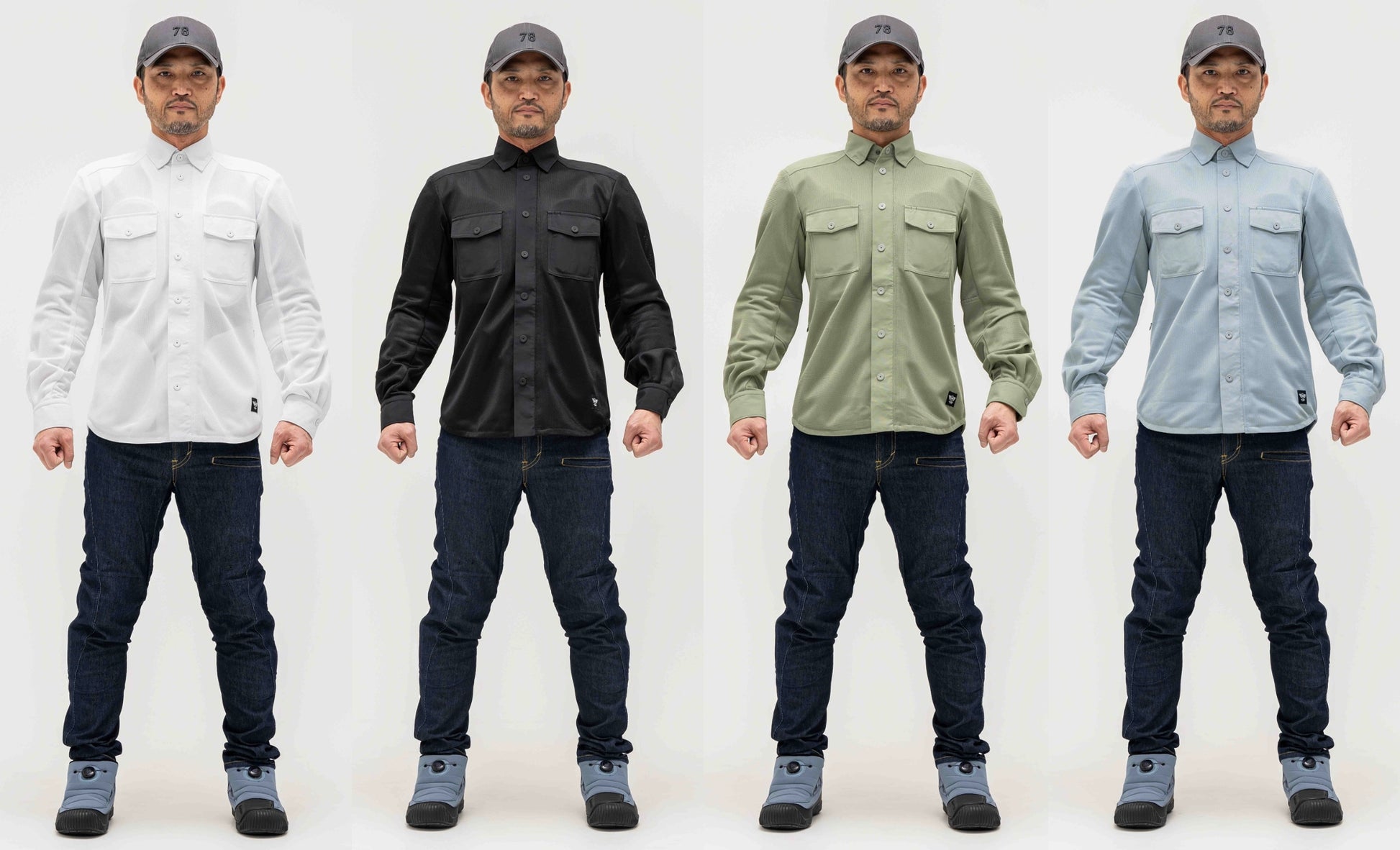 24年に【空冷式シャツ】を着用頂いたライダーより多くの要望がありました。「ホワイト、ブラック以外のカラーが欲しい!」と。アンケートを取り要望の多かったカーキ(グリーン)とブルーを追加して25年【空冷式シャツ】は4カラー展開になります!そして、昨年はメッシュ素材とそれ以外の素材の色を同色系で配色にしていましたが、25年版はそれらを同色にして、よりシャツとして着用しやすい様に改良しています!