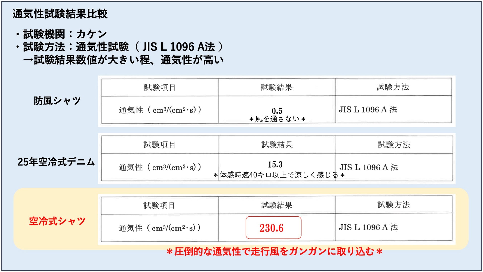 こうやって第三者機関の通気性試験結果を見ると、圧倒的な走行風の取り込みが分かると思います!毎秒230.6ccの風を1㎠あたりで取り込みます。このメッシュ素材だ・か・ら、走行風を効率的に最大化して取り込む事ができます(同時に熱を排出する事ができる)!なので必要以上に涼しいですよ(笑)24年の検証から・・・気温20度以上でないと風邪引くと思いますよ(笑)