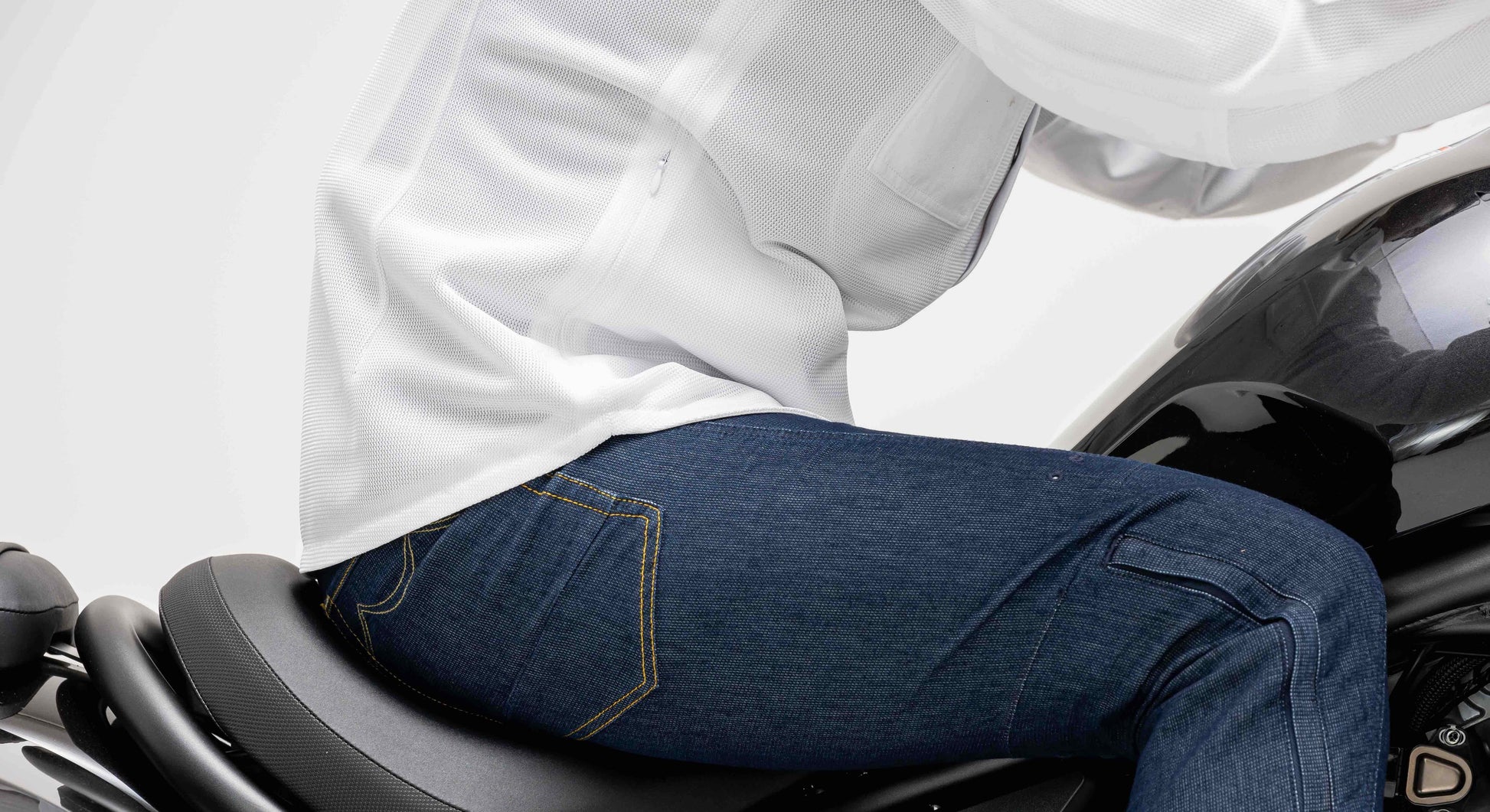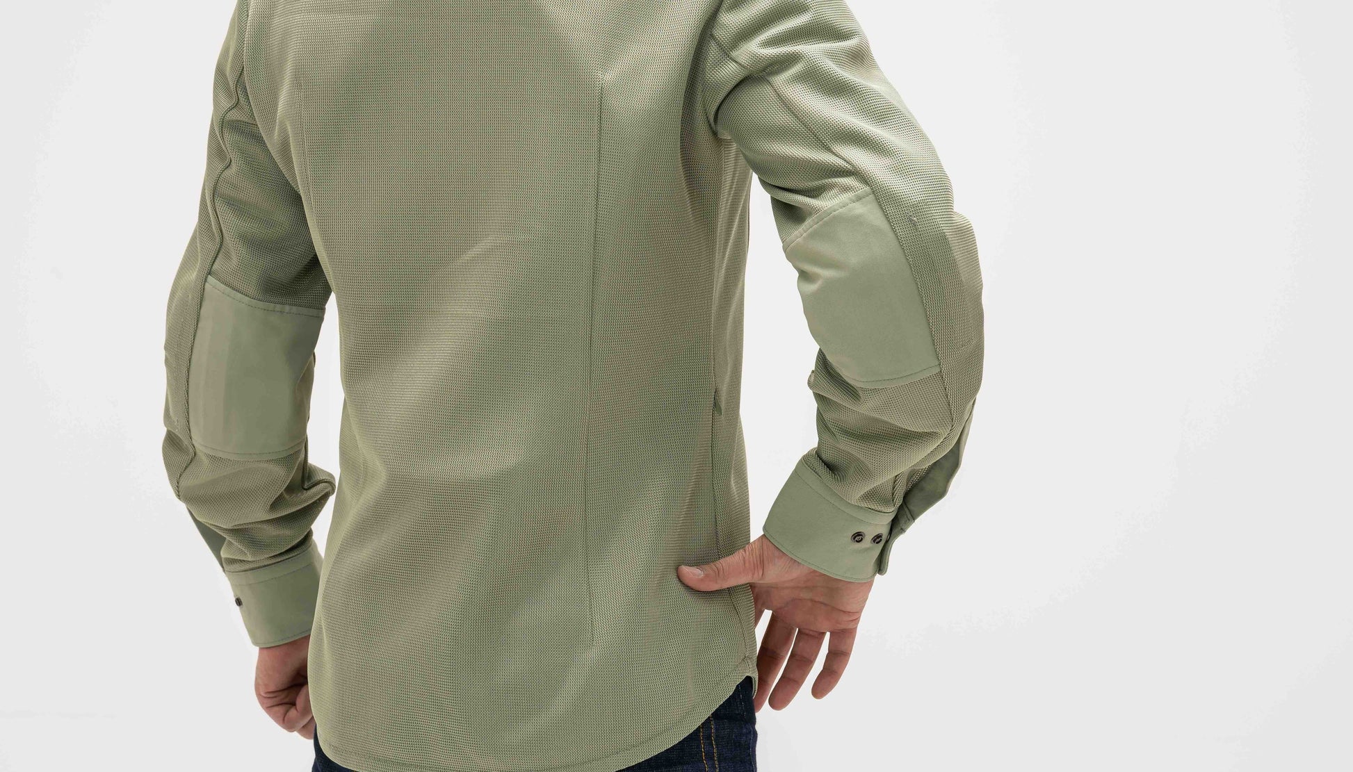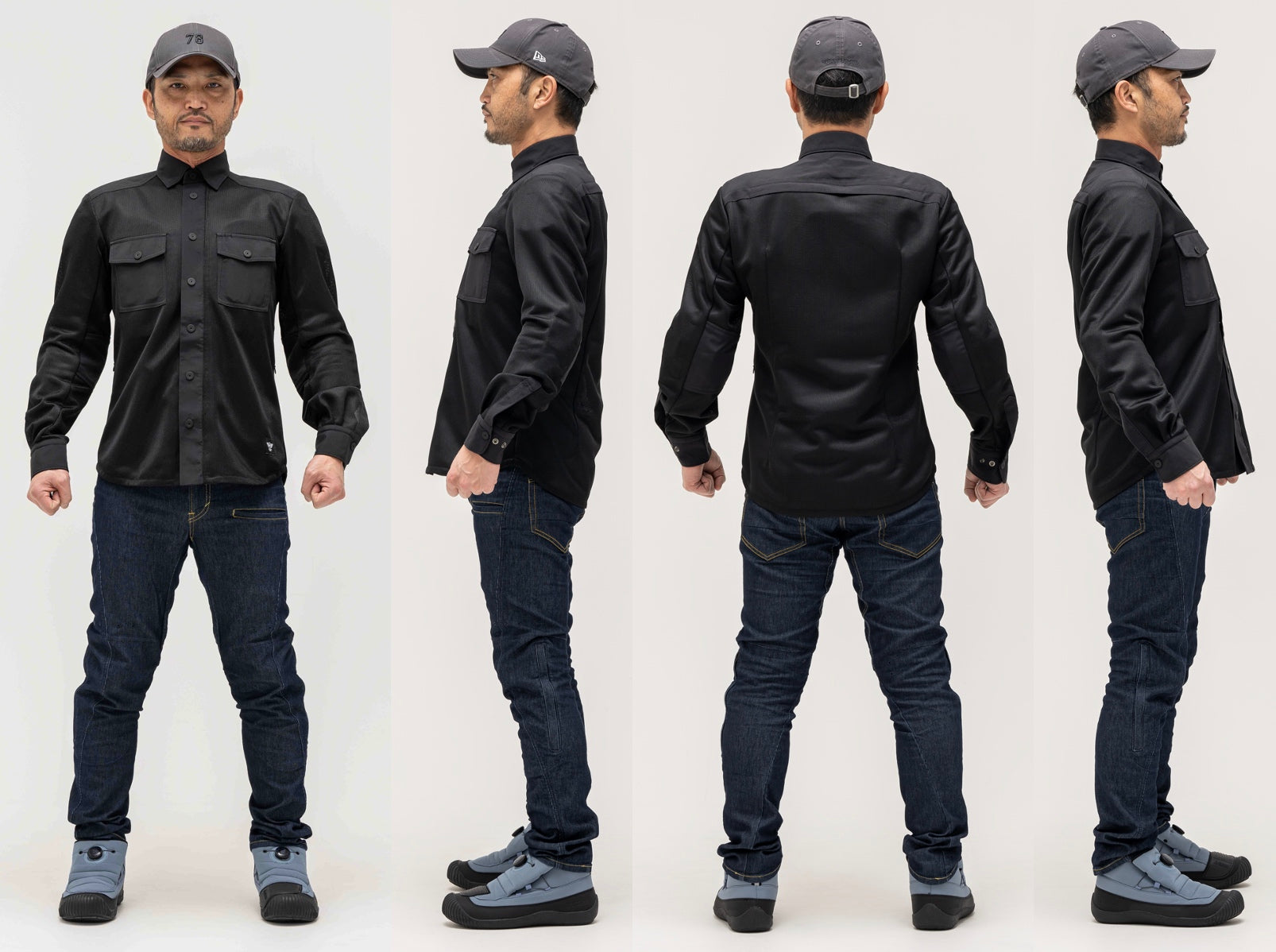 バイク乗車には乗車姿勢に関わらず肩周辺の動きが重要になります。見た目はスマートなシャツですが肩周辺にゆとりがあり肩甲骨から肩までの動きが最適化されています。