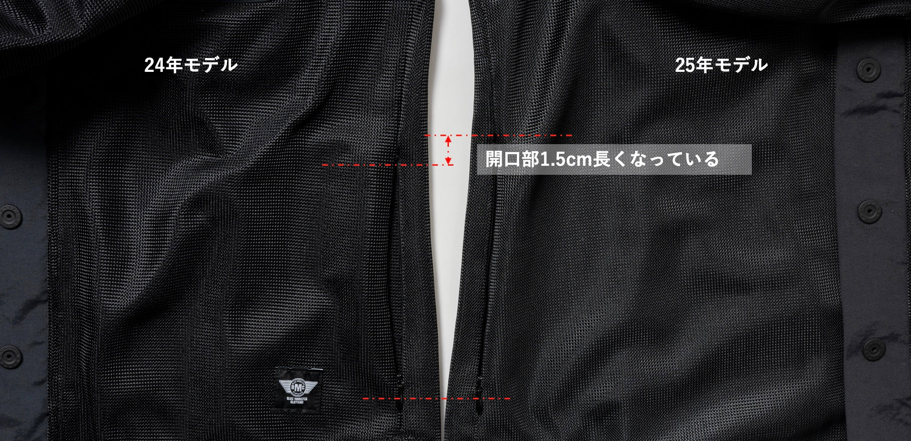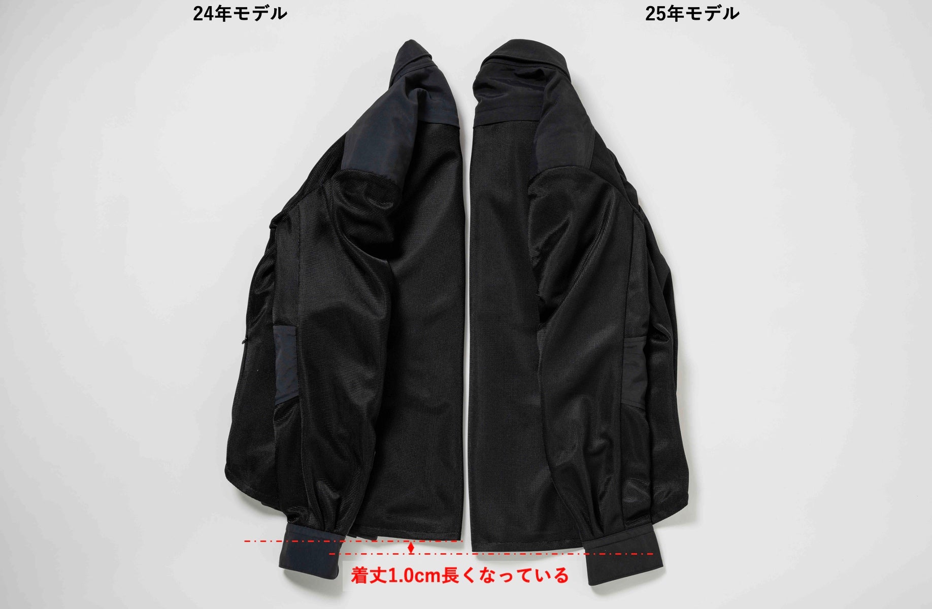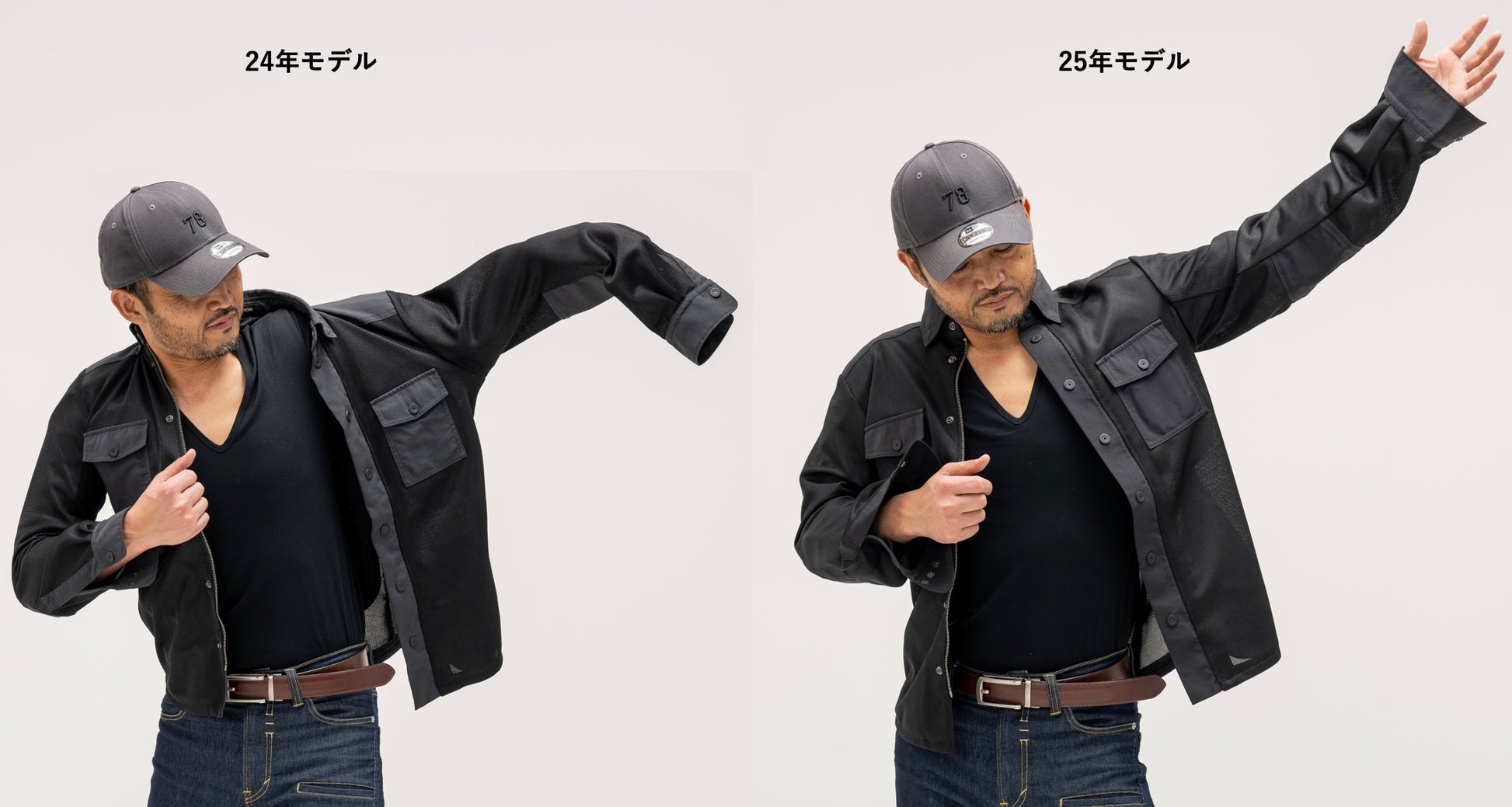 24年版着用のライダーから強く要望がありました袖に腕を通す時の引っ掛かり・・・25年【空冷式シャツ】は全てのプロテクター配置を見直し、よりスムーズに着用できる様に改善しています!