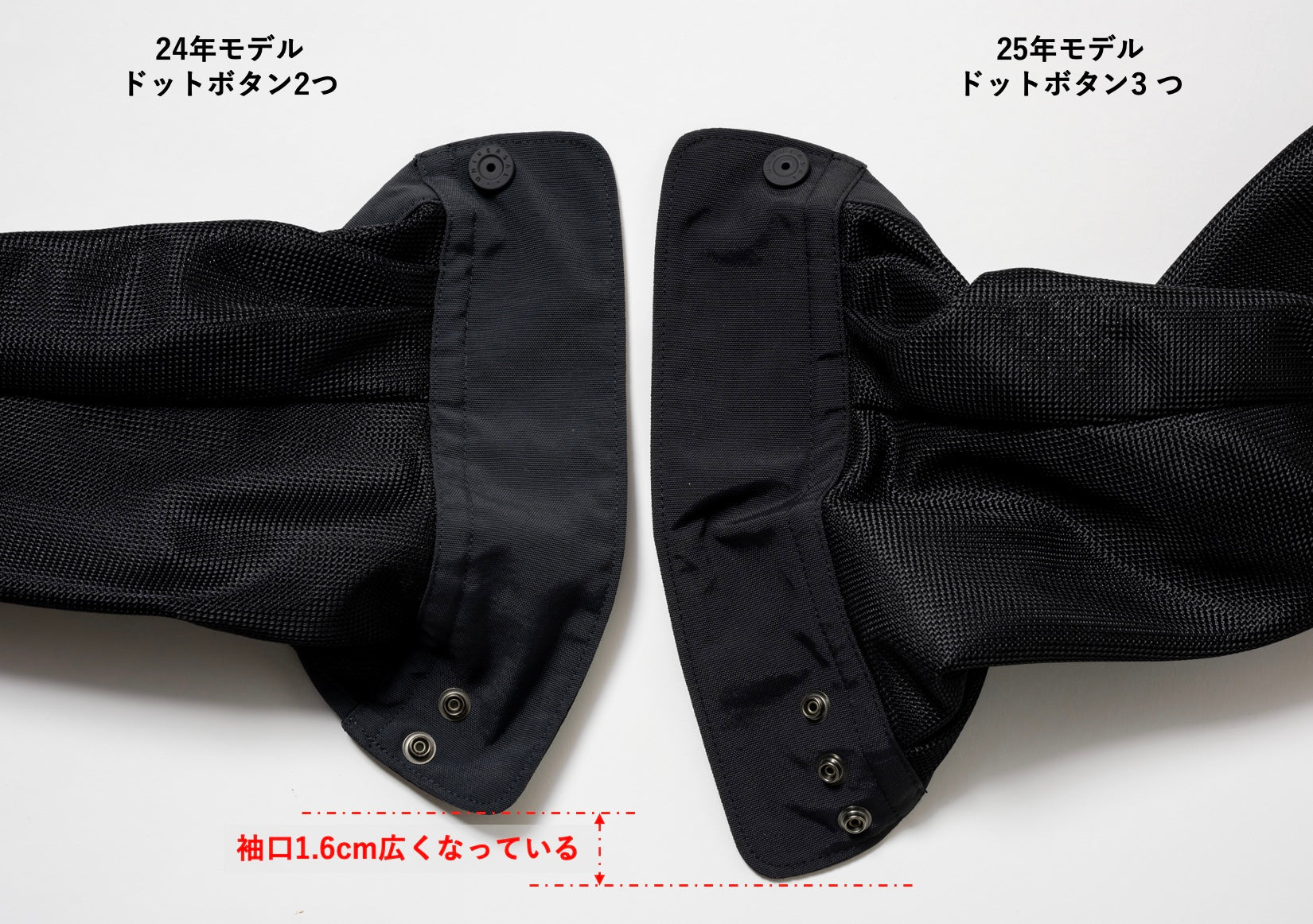 まずお詫びします・・・24年版の裾幅だと腕時計した際に非常に袖口を閉めにくいです。ローリー青野自身も使用し毎回イライラしてました(笑)この件に関して【空冷式シャツ】ライダーからも改善要望を頂いています。そこで25年版は、腕時計対応した袖型(左右)を開発し・・・あのイライラを完全解消しています!この新しい袖型は腕時計ライダーを救う画期的なものです٩( ᐛ )و