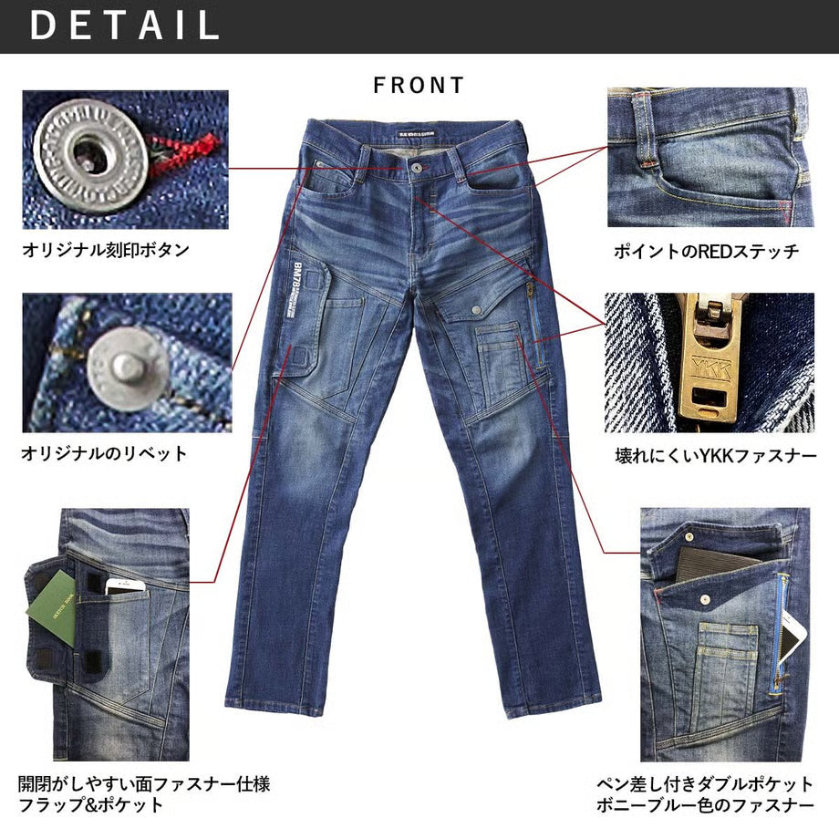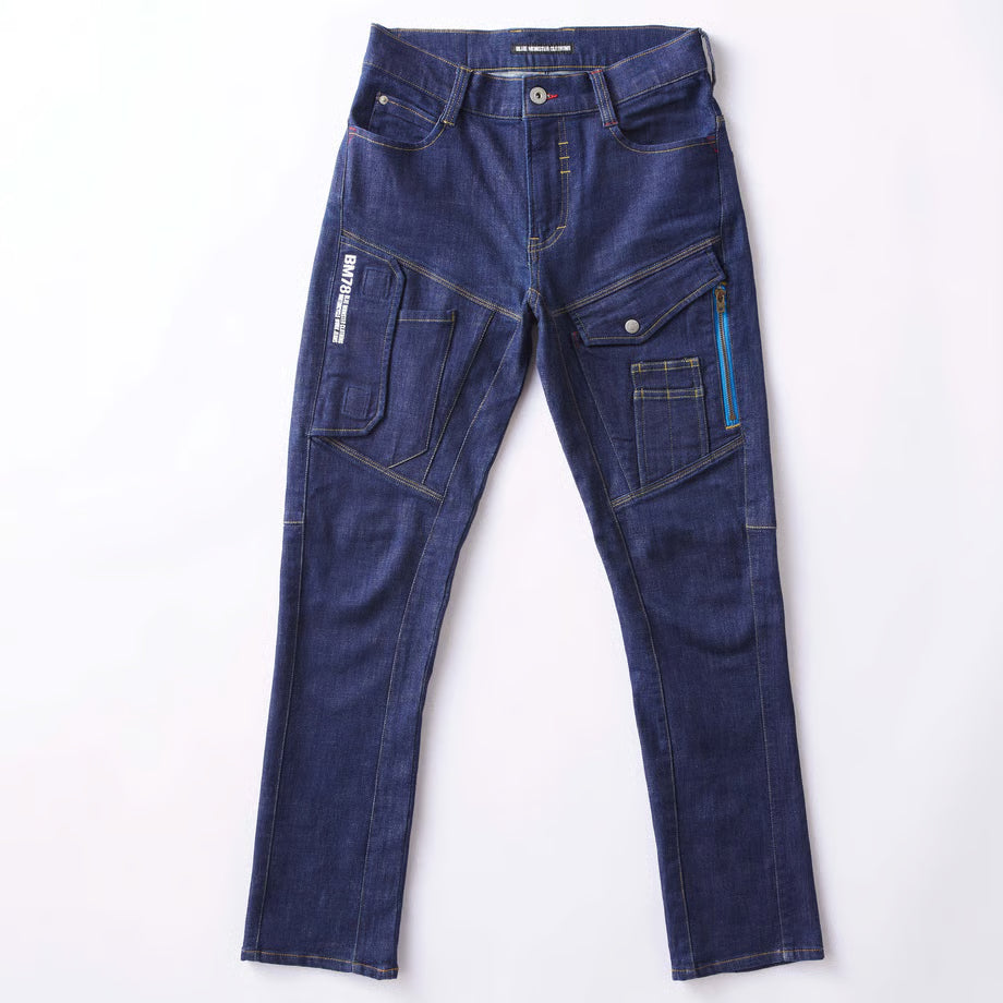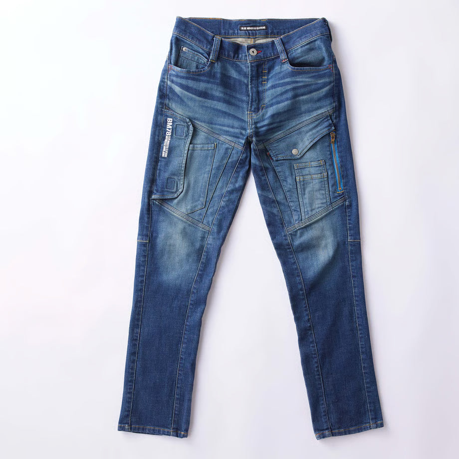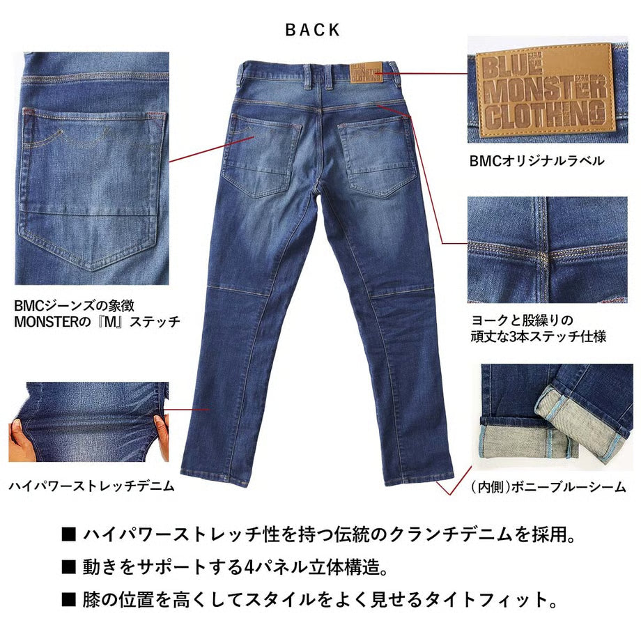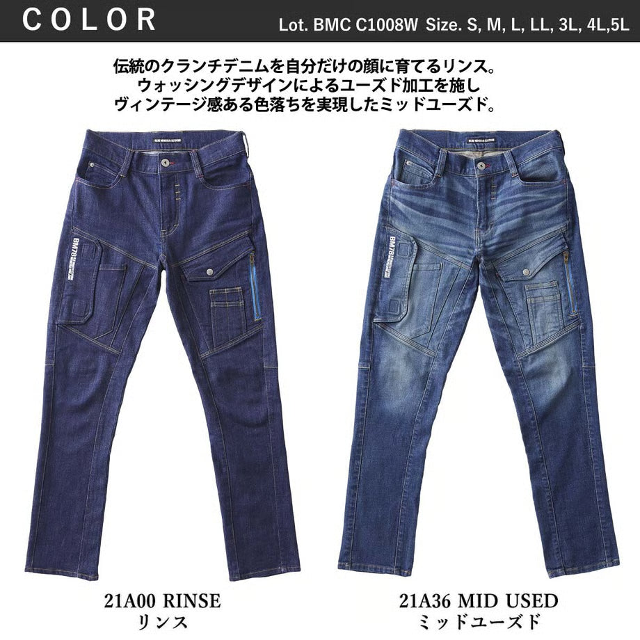 男らしい美シルエットを追求したすっきりと見せる4パネル構造のタイトテーパードシルエット。 BMCオリジナルのパターンとカッティング技術により、ストレスフリーな穿きやすさと機能性を実現しました。快適性を兼ね備えたハイパワーストレッチ性を持つ伝統のクランチデニムを採用しています。 モモの切り替えパネルにより、より足の動きに対応する進化形。 左右には進化系カーゴポケットを配置し便利さが向上しました。