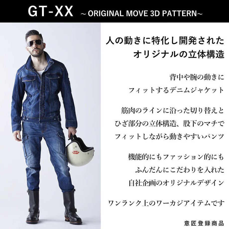 男っぽい印象のワークパンツは、 GT78-XXシリーズの同色デニムジャケットと上下セットアップが可能。単体のファッションアイテムとして、シンプルにTシャツやカットソー、シャツ、セーターと合わせるだけでかっこいい。アウターも、パーカー、Gジャン、革ジャン、コートなど、様々なコーディネートができて着回しがきく。ワークやミリタリー系はもちろん、アメカジもオシャレ。