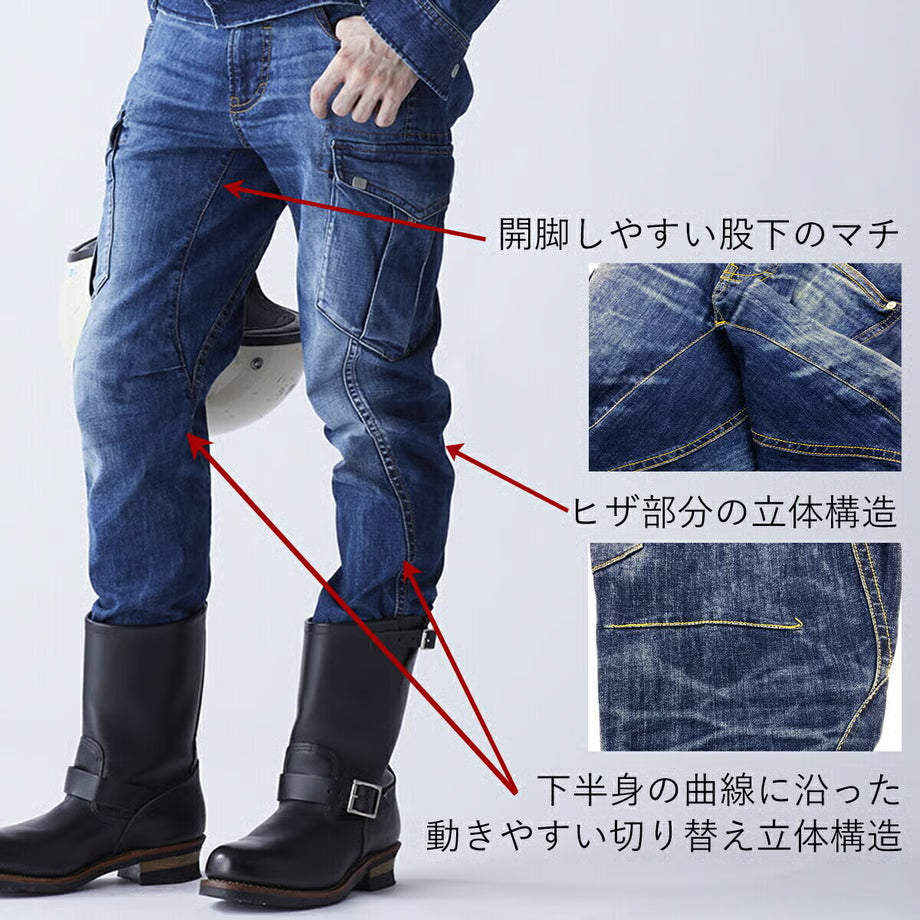 屈む・座る・開く動きをデフォルトした立体構造で、下半身の動きにフィットするファッション×バイク×機能的なデニムパンツ。