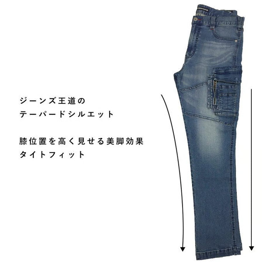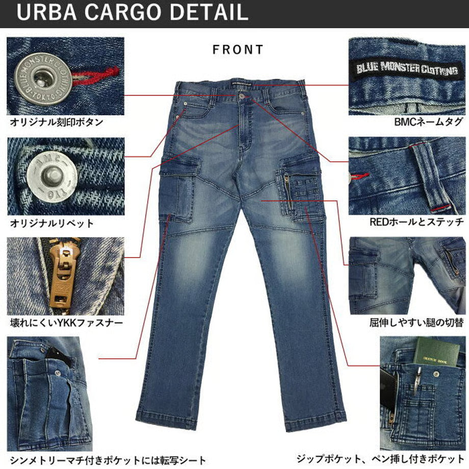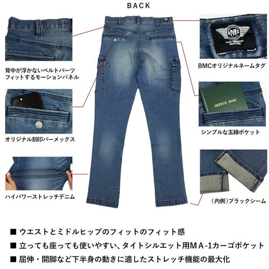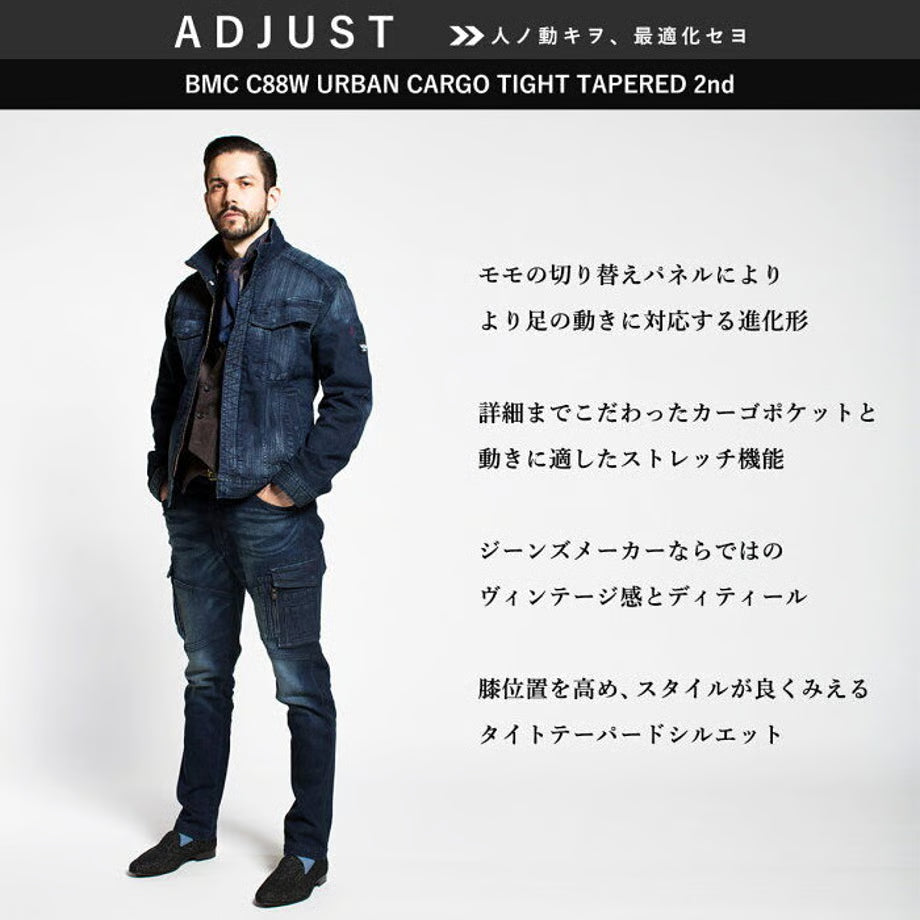 男らしい美シルエットを追求したすっきりと見せるタイトテーパードシルエット。 BMCオリジナルのパターンとカッティング技術により、ストレスフリーな穿きやすさと機能性を実現しました。 生地からこだわり、快適性を兼ね備えたハイパワーストレッチデニムを使用しています。 モモの切り替えパネルにより、より足の動きに対応する進化形。 左右には大きめのカーゴポケット(左腿ポケットはジップ付きMA-1カーゴポケット)と、バックポケット(シンプルかつ使いやすい玉縁ポケット)を配置し便利さが向上しました。