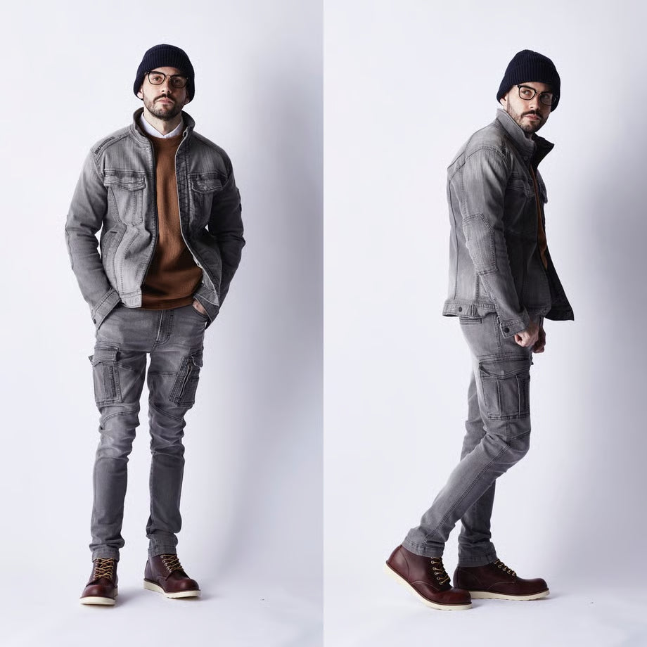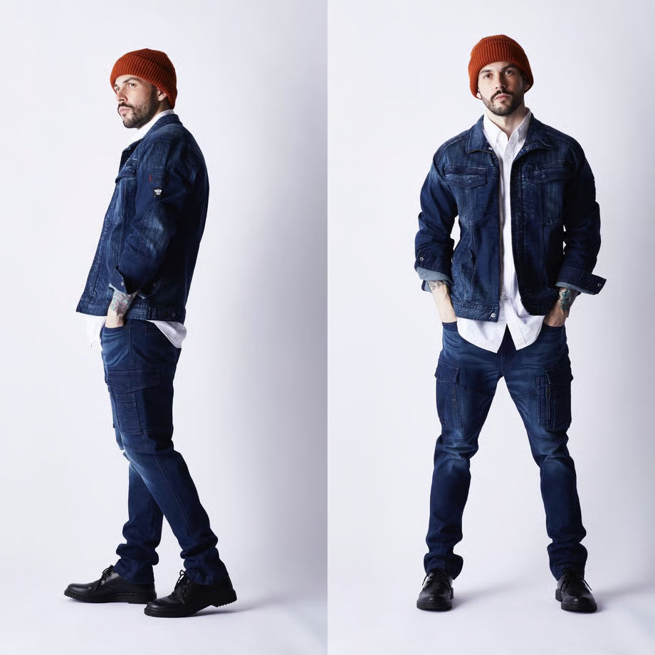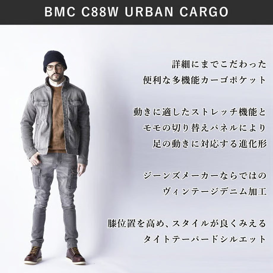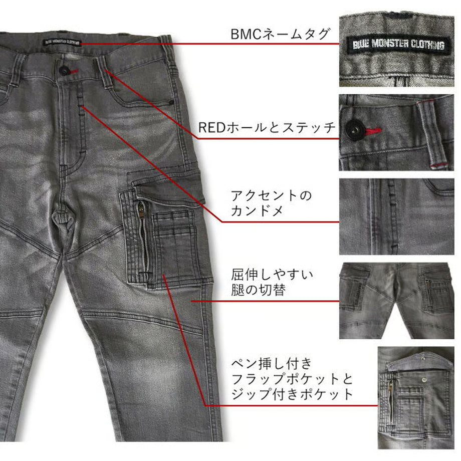 男らしい美シルエットを追求したすっきりと見せるタイトテーパードシルエット。 BMCオリジナルのパターンとカッティング技術により、ストレスフリーな穿きやすさと機能性を実現しました。 生地からこだわり、快適性を兼ね備えたハイパワーストレッチデニムを使用しています。 モモの切り替えパネルにより、より足の動きに対応する進化形。 左右には大きめのカーゴポケット(左腿ポケットはジップ付きMA-1カーゴポケット)と、バックポケット(シンプルかつ使いやすい玉縁ポケット)を配置し便利さが向上しました。