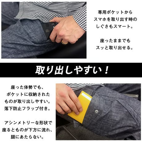 パンツのデザインを損ねず、取り出しやすい位置に設計されたスマートフォン専用ポケットを左足前面に配置。立っても、座っても出し入れしやすい構造です。