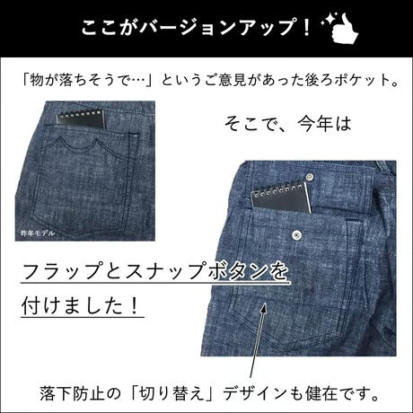今年は後ろポケットに落下防止のフラップが付いた進化形。