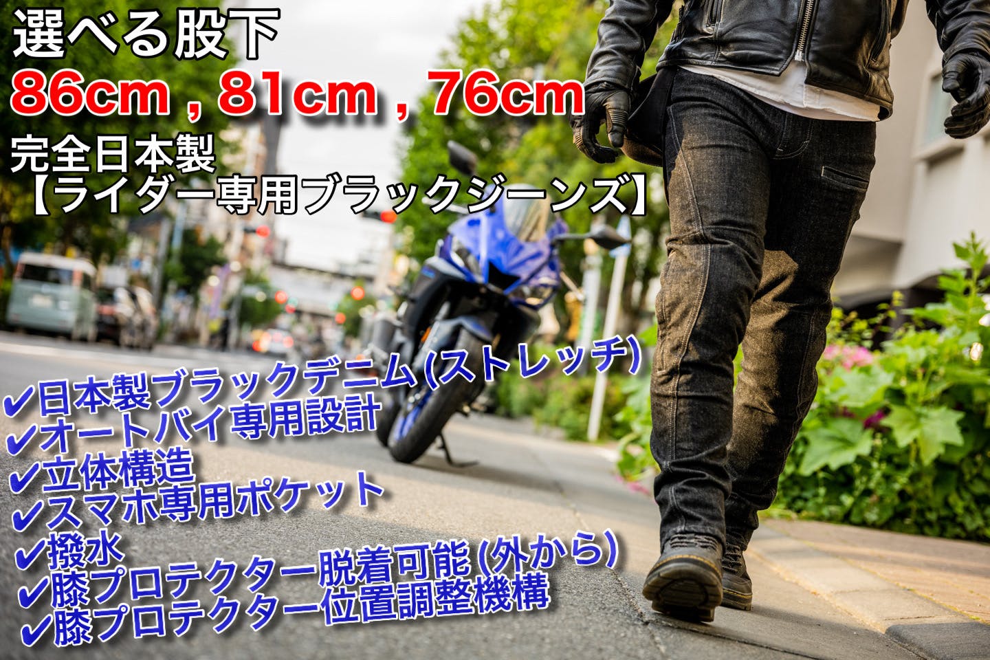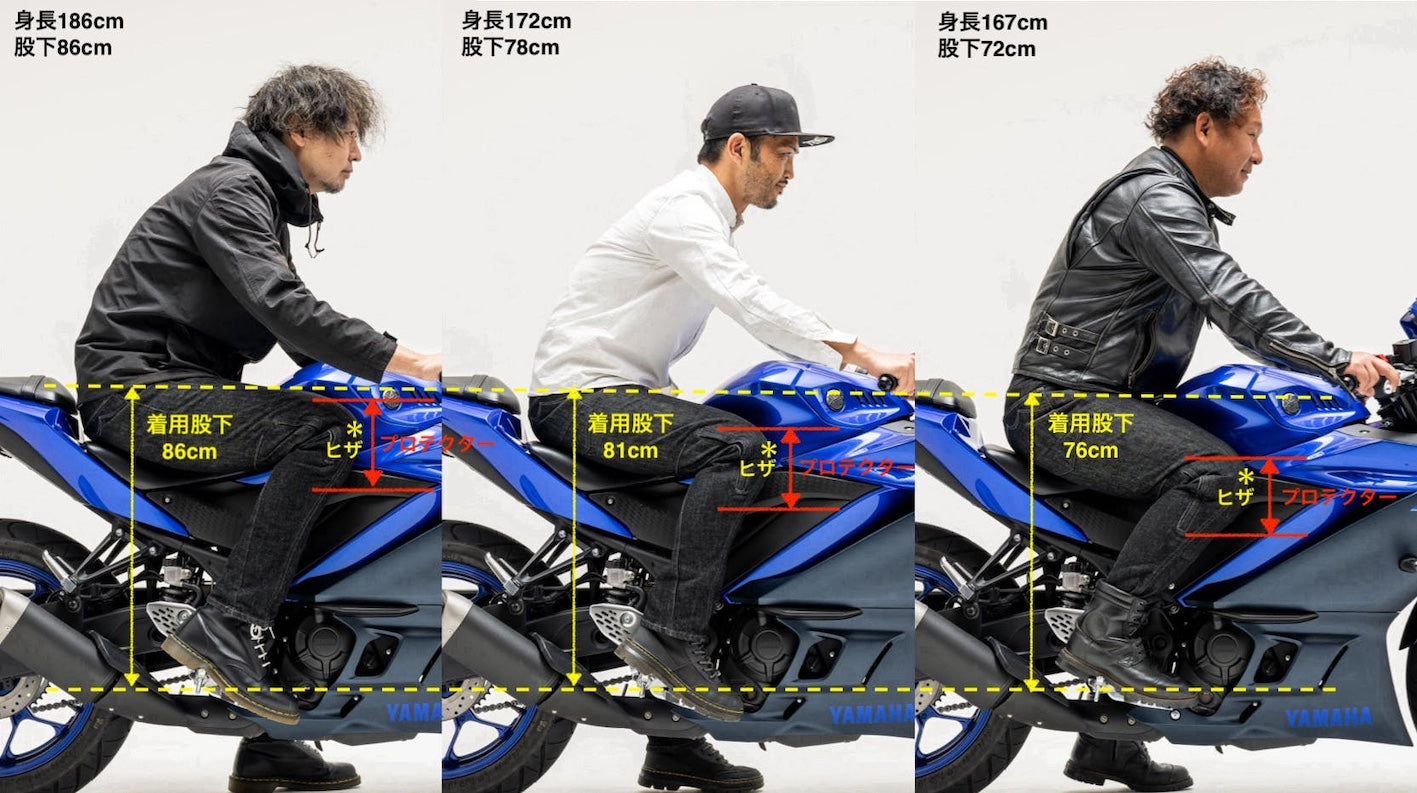 バイクに乗っても、降りても、最適な股下設定とシルエット設定がされています。