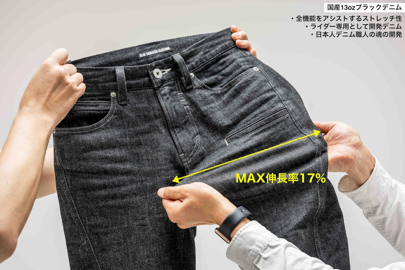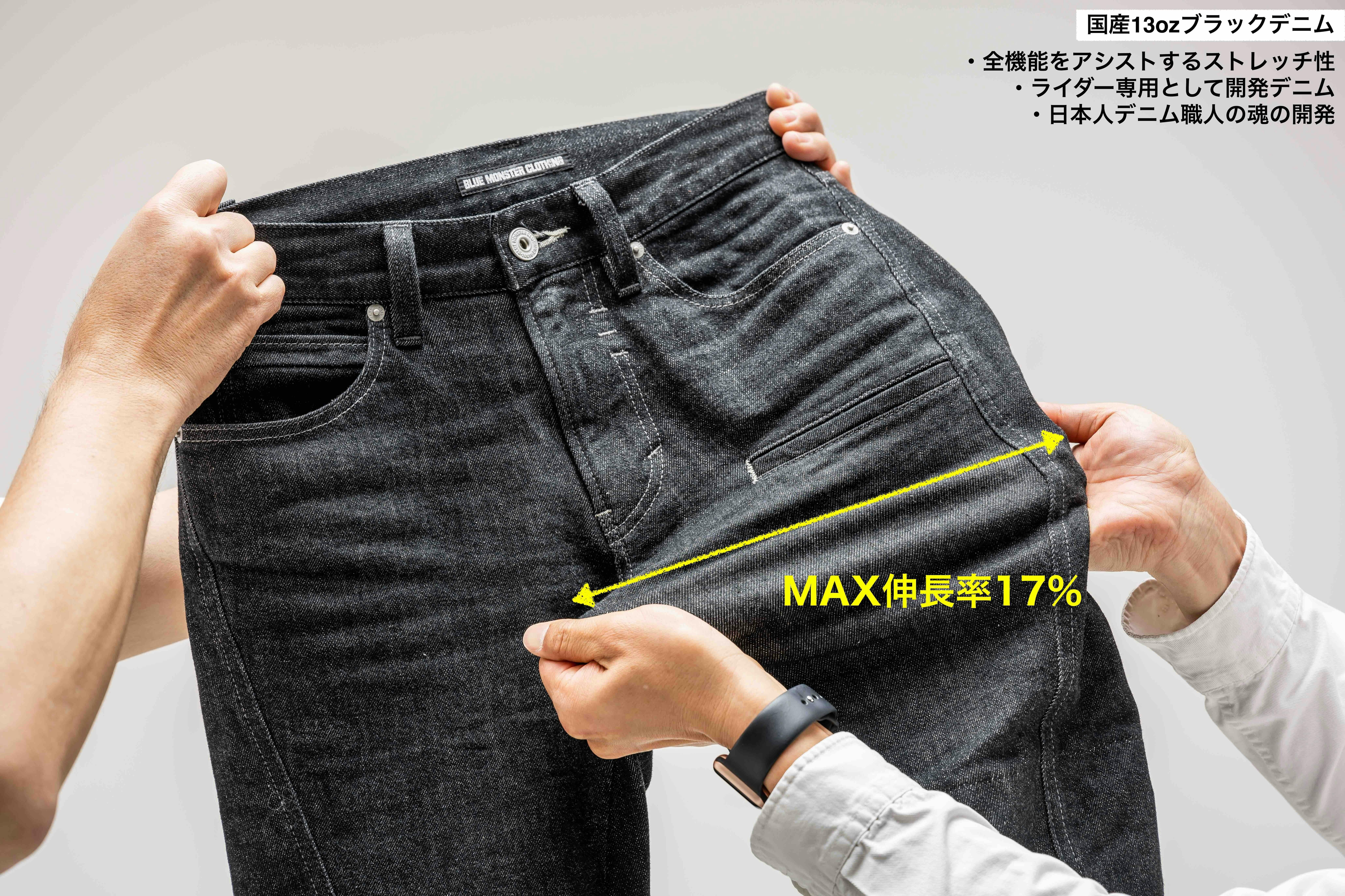 ライダーの為だけに開発された国産13ozブラックストレッチデニムなんです。