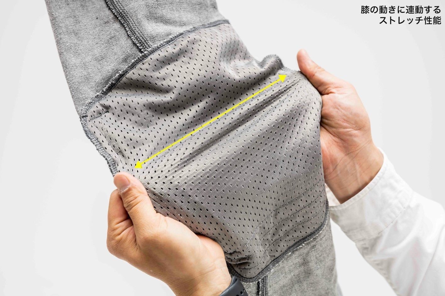 ライダーの脚の屈曲運動を妨げ図、膝の動きに連動する為に、膝プロテクター袋のメッシュ素材もストレッチにしていますよ。