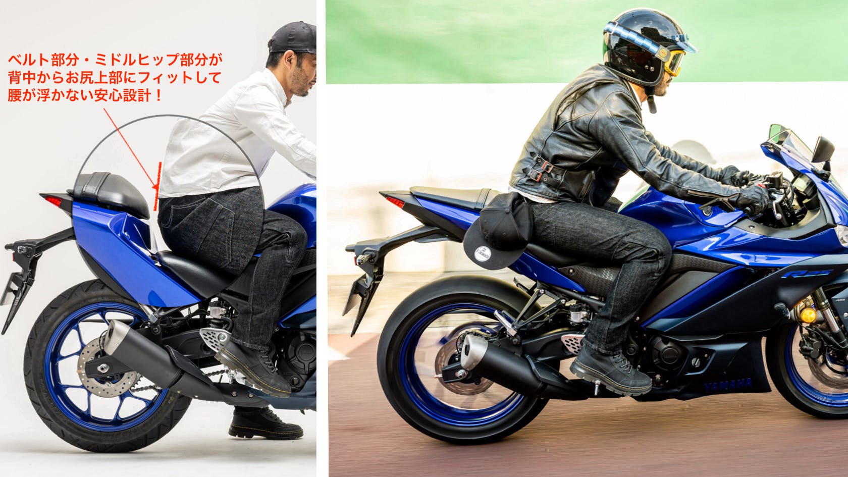 腰部分に対するストレス軽減を目的とした機能ですが・・・実は、身体を曲げる・腰部分のダボつきが起きない様にバイクに乗っている姿が美しく見えるという機能も有しています。
