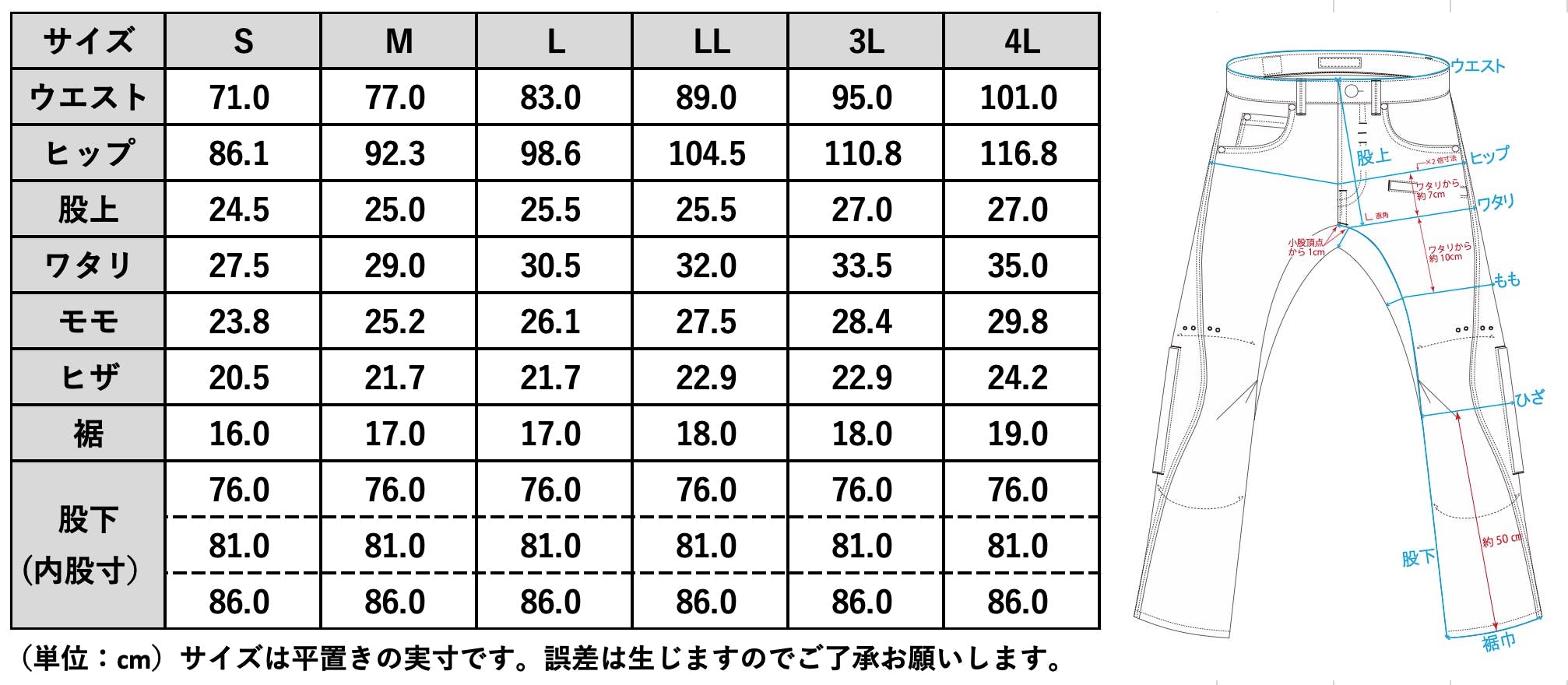 -ご購入の際には、必ずサイズ表をご確認いただいたうえでご希望のサイズ(ウエスト・股下)をお選び下さい。