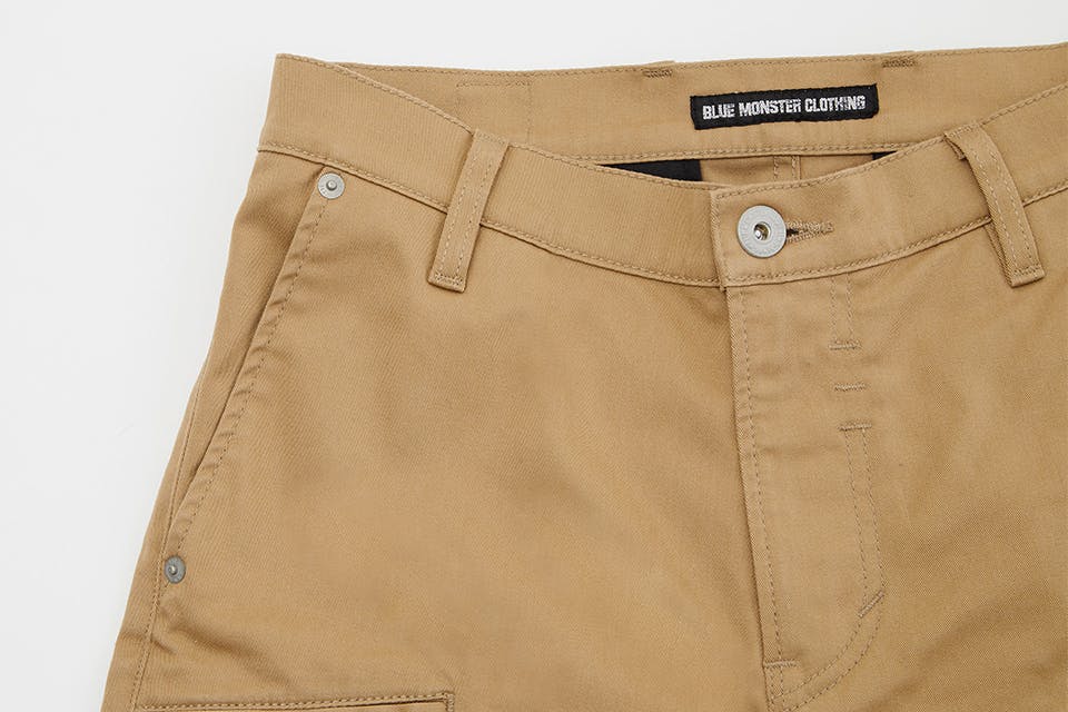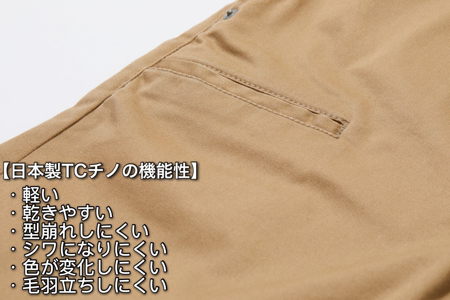 ◆機能に特化したワーキングウェアで使用される日本製TCチノ素材(ポリエステル混)。