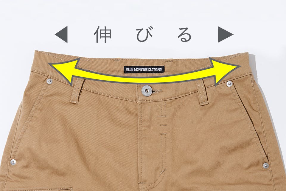 ウエストってパンツ構造において重要な部分ですのでビヨーン!ビヨーン!には伸びませんが、お腹の自然なサイズアップには十分に対応できる10%の伸び率を保有しています。