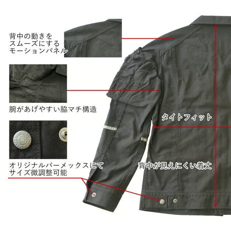 作業時の快適性も考え、腕を上げやすいよう袖下にマチが付いたパターン設計。