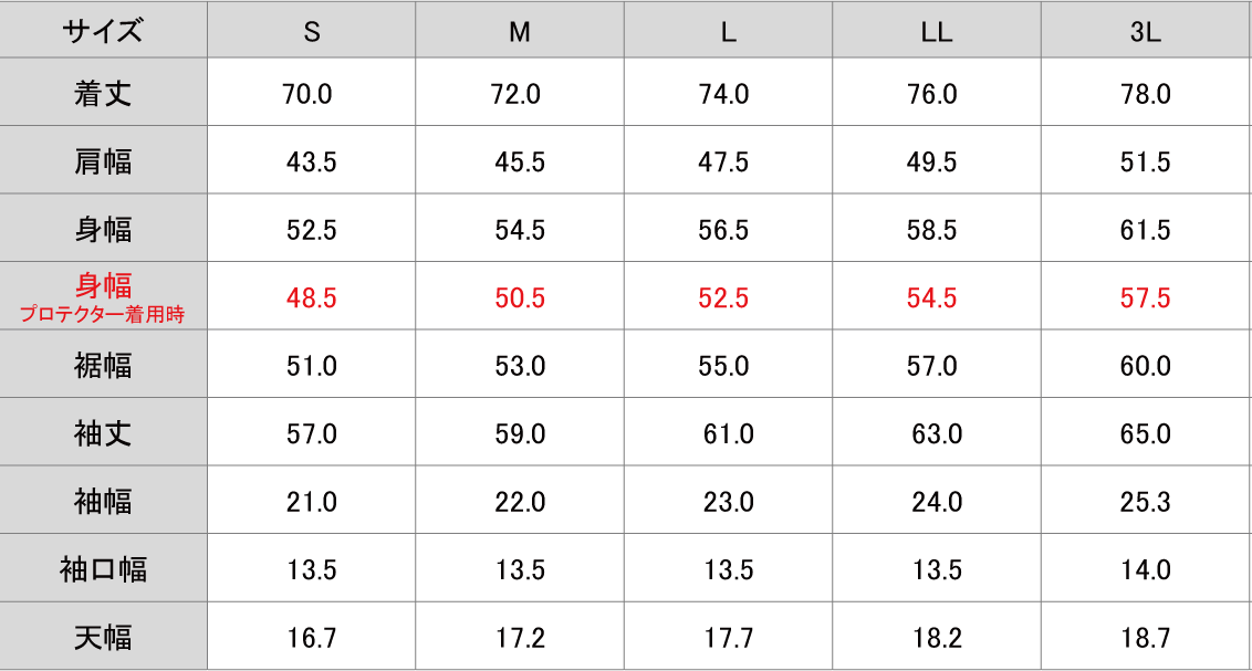 *身幅は、表内赤字 「身幅 プロテクター着用時」の寸法をご参考にして下さいませ。