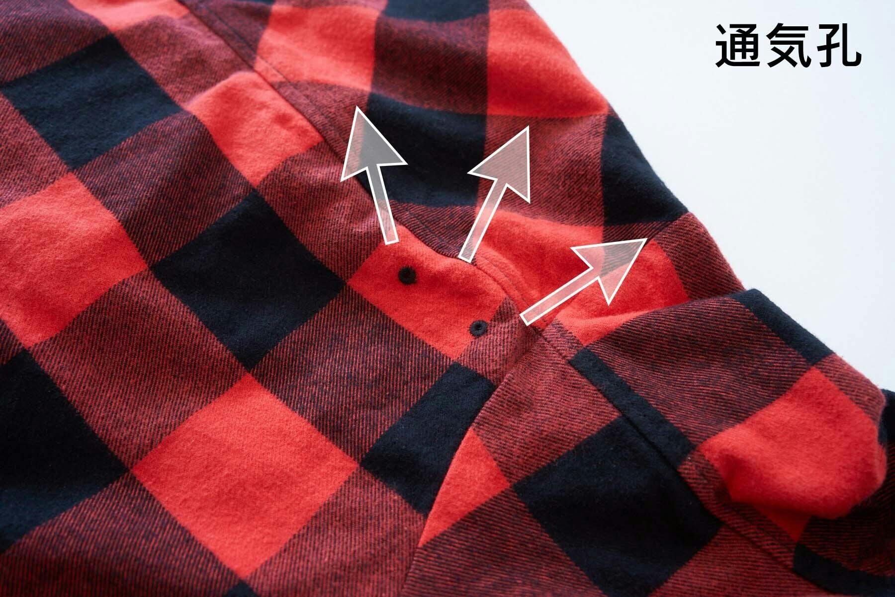 そこから入る風(空気)を外に逃す(排出する)為に、脇下・背中に通気孔を設定しています。