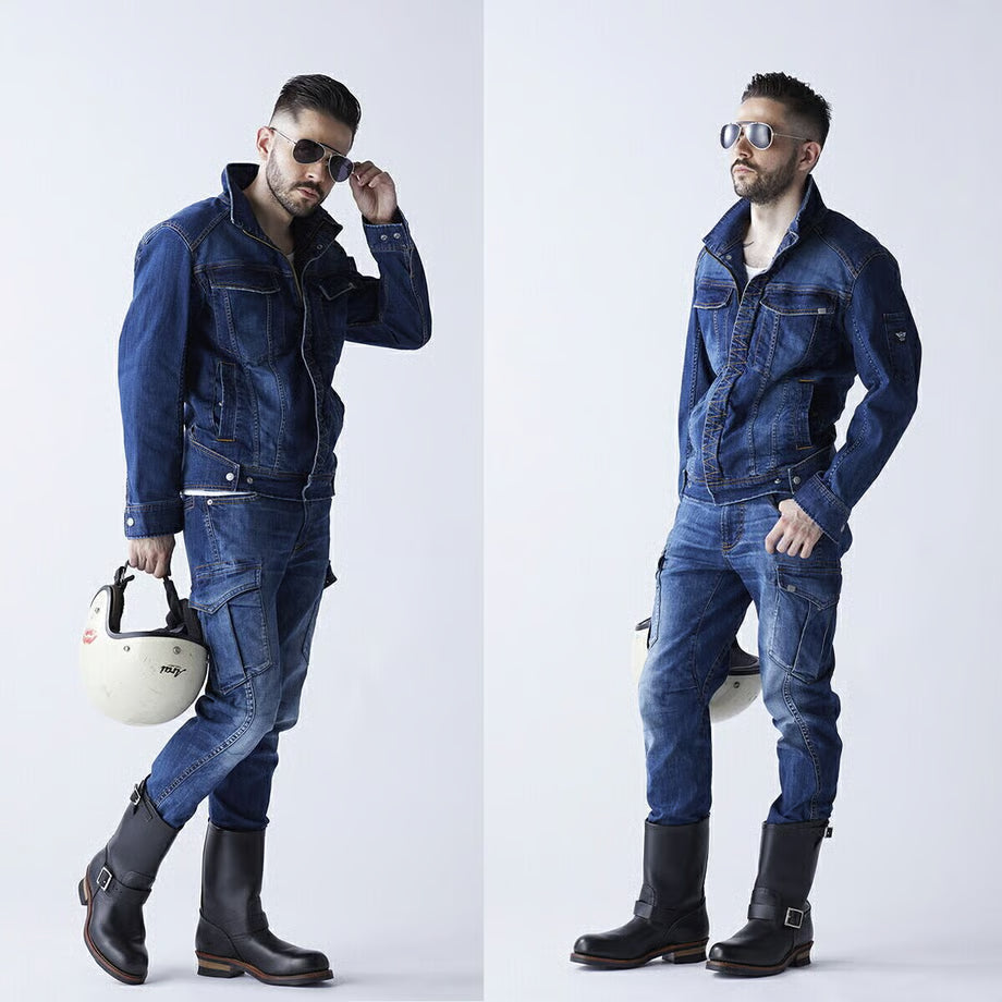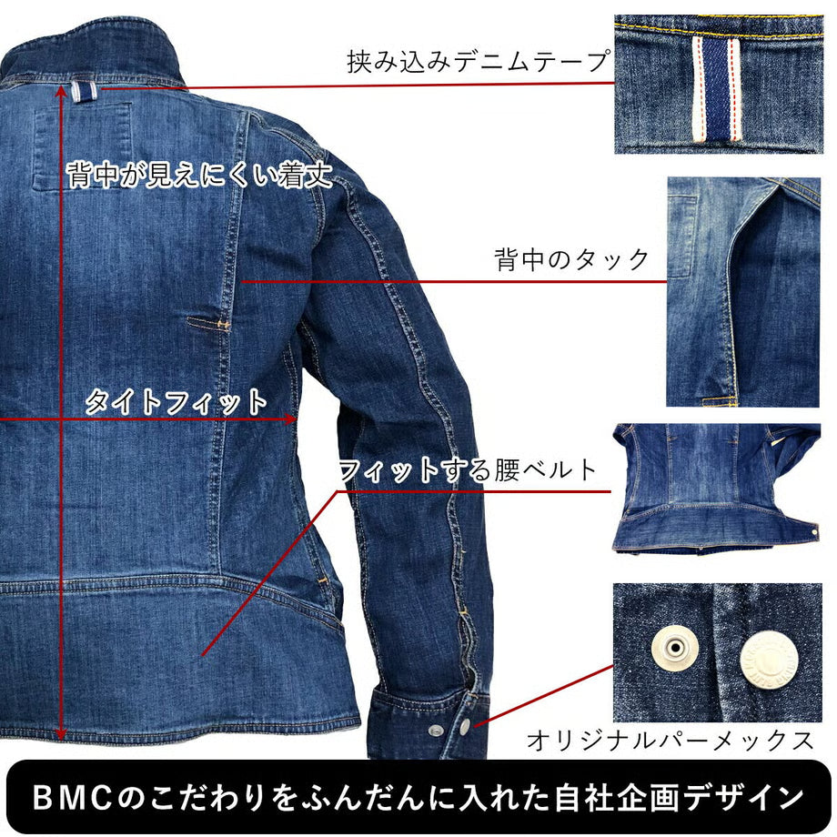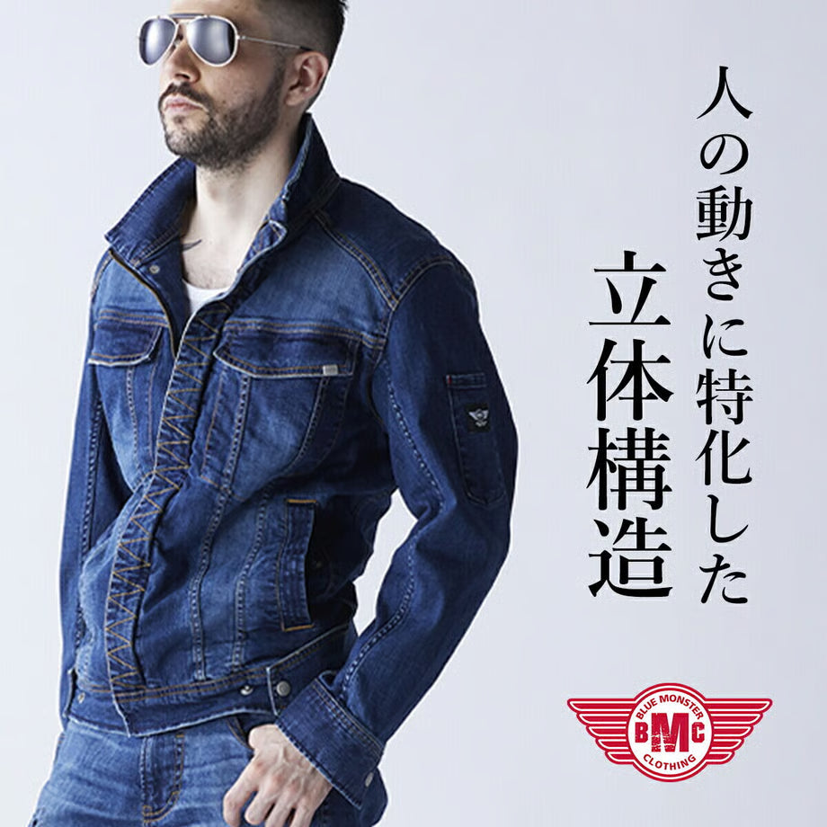 BMC(ブルーモンスタークロージング)の、背中や腕の動きにフィットするように作られた立体構造パターンのファッション×バイク×機能的なデニムジャケット。